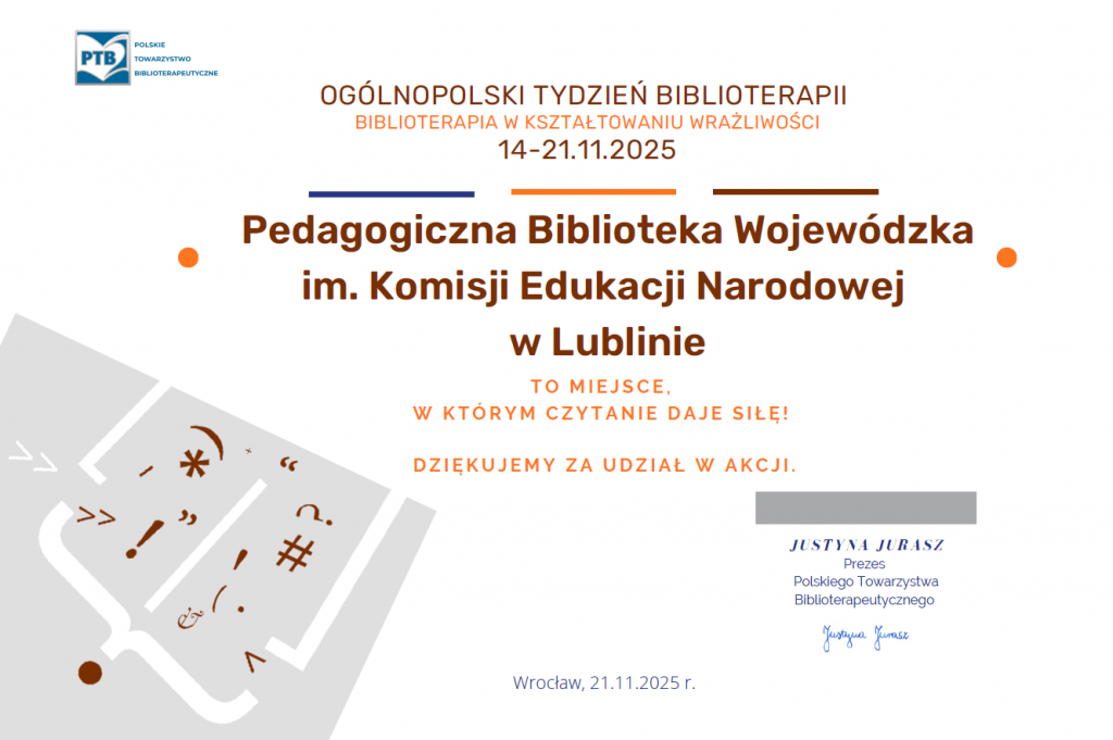 Składamy serdeczne podziękowania Polskiemu Towarzystwu Biblioterapeutycznemu za przyznane wyróżnienie oraz możliwość uczestnictwa w tej cennej inicjatywie!