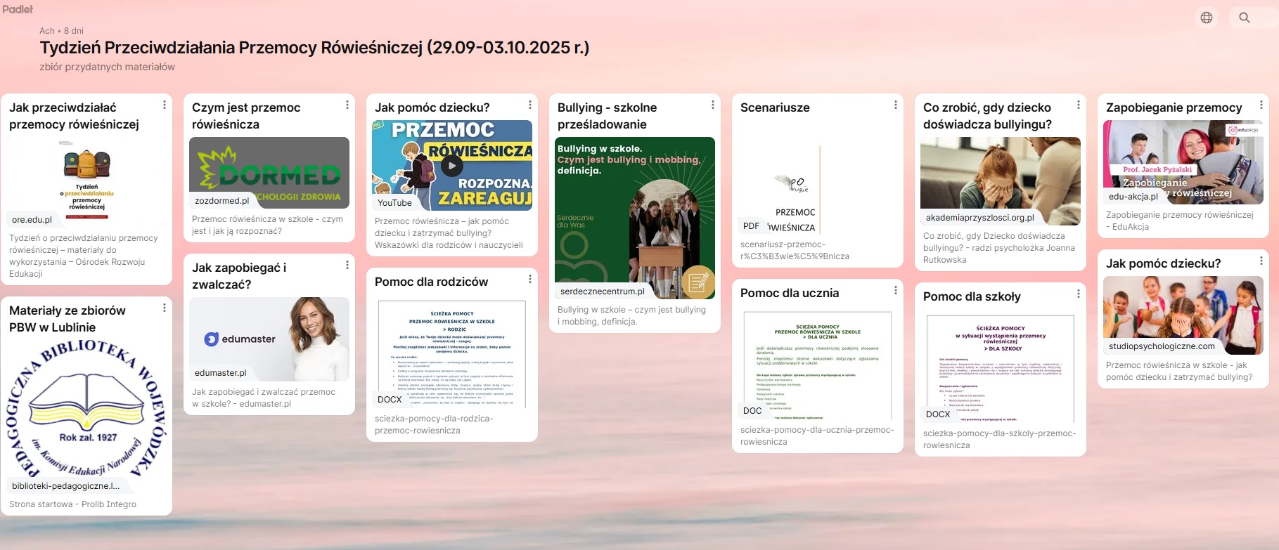 Zapraszamy do skorzystania z materiałów edukacyjnych przygotowanych przez naszą bibliotekę - padletu „Tydzień Przeciwdziałania Przemocy Rówieśniczej” opracowanego przez Agnieszkę Chaber i zestawienia bibliograficznego „Przeciwdziałanie przemocy rówieśniczej” opracowanego przez Ewelinę Czajkowską.