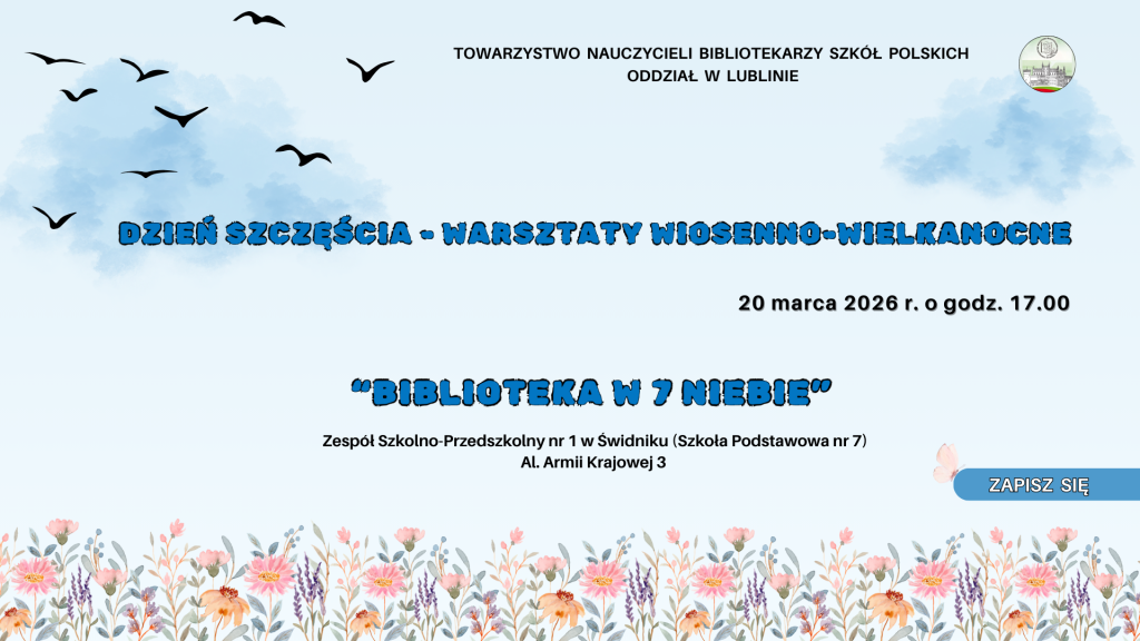 Zapraszamy członków i sympatyków Towarzystwa Nauczycieli Bibliotekarzy Szkół oraz wszystkich zainteresowanych na pełne radości warsztaty wiosenno-wielkanocne. Koleżanki z „Biblioteki w 7 Niebie” – Anna Wiśniewska i Katarzyna Olejnik – obiecują dobrą zabawę, moc niespodzianek i niebiańskie wrażenia.