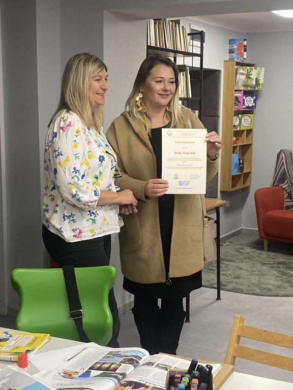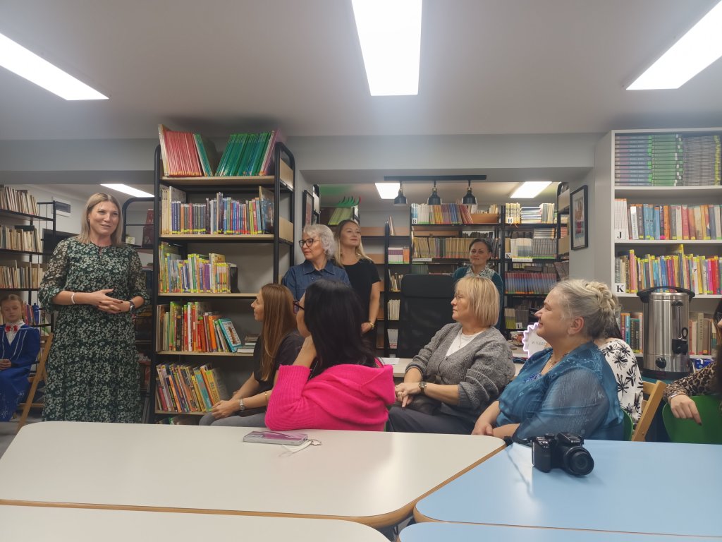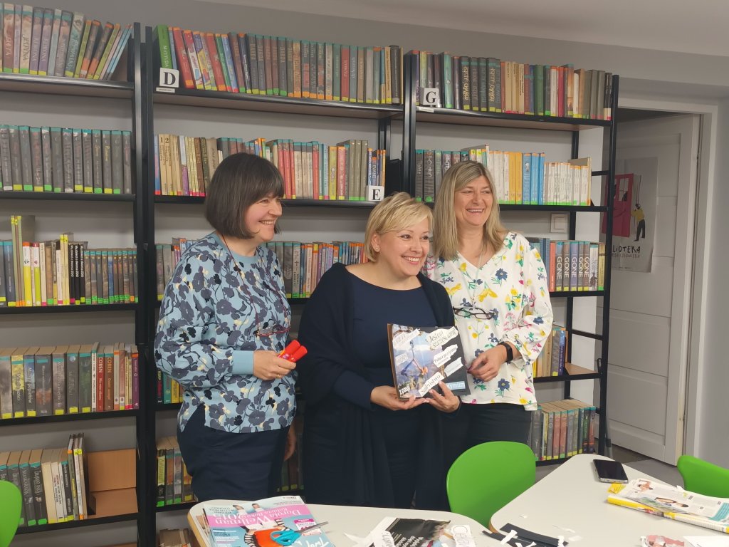Pani Beata Sławacka zaprezentowała film, który pozwolił nam obejrzeć dawny wystrój biblioteki oraz etapy odnawiania zalanej przestrzeni. Największe wrażenie zrobiły na nas porywy serc całej społeczności szkolnej. Rodzice, nauczyciele i uczniowie wzięli odpowiedzialność za bibliotekę, dzielili się swoim talentem, wiedzą i siłą rąk. To zapewne dlatego przestrzeń odnowionej biblioteki jest tak magnetyzująca.