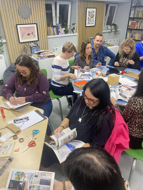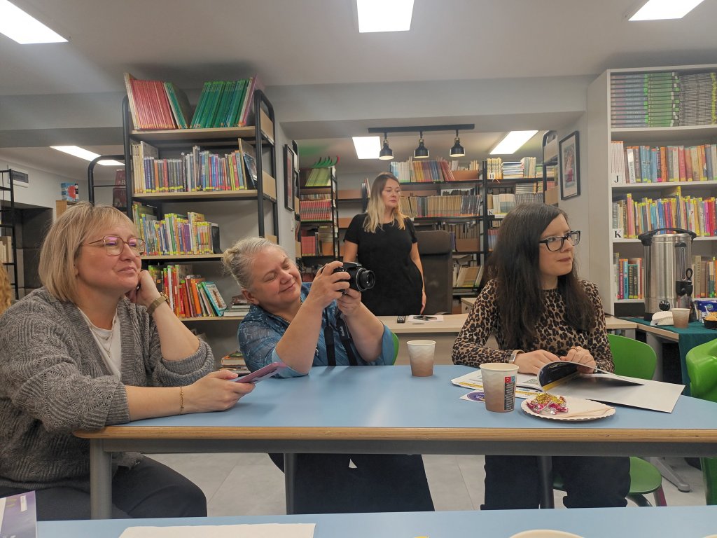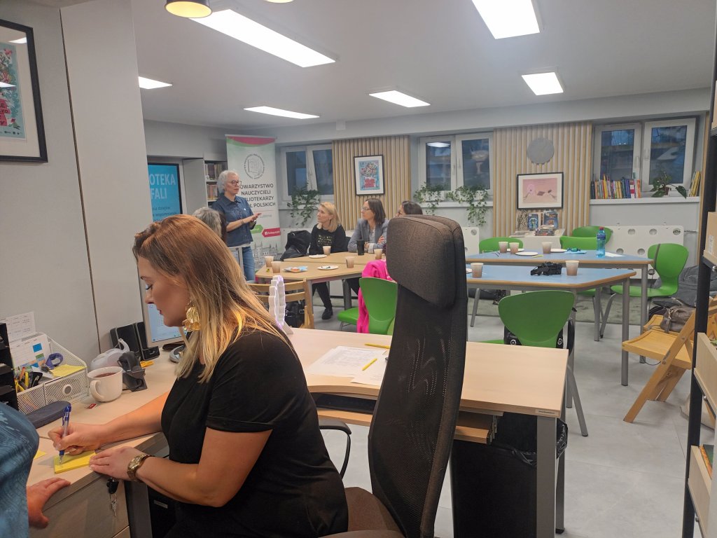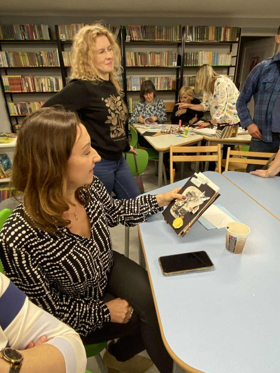 W drugiej części odbyły się warsztaty, oparte na niezwykłej książce „Tyle się wydarzyło i tyle jeszcze nas czeka” Johanny Schaible. Pracowaliśmy w grupach i tworzyliśmy nasze wersje tego, co było, jest i być może. To była naprawdę niezwykła podróż w głąb siebie. Podróż na przekór upływającemu czasowi. Nie chciało nam się wychodzić. Zapewne uczniowie i uczennice też ciągnie do tej wspaniałej „Biblioteki na fali” (bo jakąż inną nazwę mogłaby ona nosić).