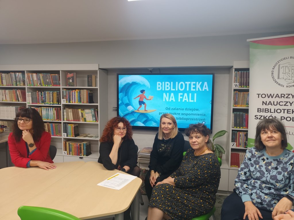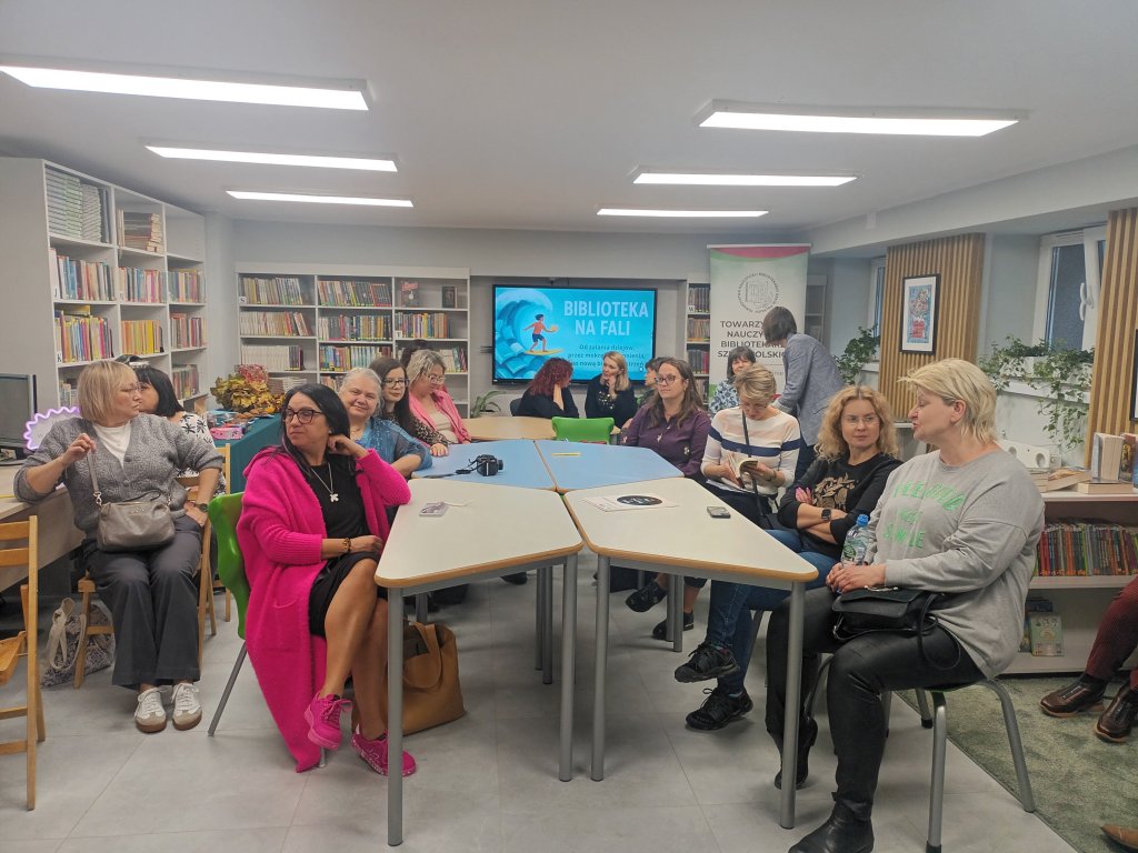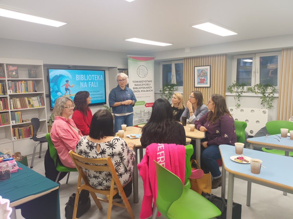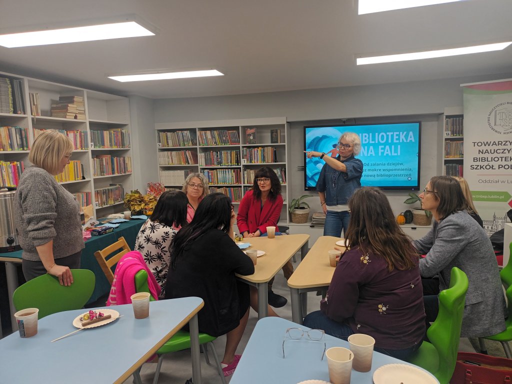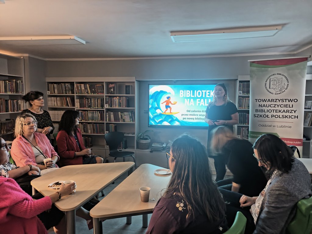 Bo czy zalanie biblioteki kojarzy się z czymś pozytywnym? A jednak ta pechowa sytuacja stała się przyczynkiem do serii zdarzeń o niezwykle pozytywnym wydźwięku. Efekty mogliśmy podziwiać podczas ostatniego spotkania Oddziału, które odbyło się 21 października 2025 r. Tego dnia panie Aneta Szadziewska i Beata Sławacka – nauczycielki bibliotekarki ze Szkoły Podstawowej nr 18 im. Macieja Rataja w Lublinie – zaprosiły nas w rejs „od zalania dziejów, przez mokre wspomnienia, po nową biblioprzestrzeń”. W spotkaniu wzięły udział bibliotekarki i bibliotekarze z Lublina, Łęcznej, Świdnika, Poniatowej i Kluszkowiec.