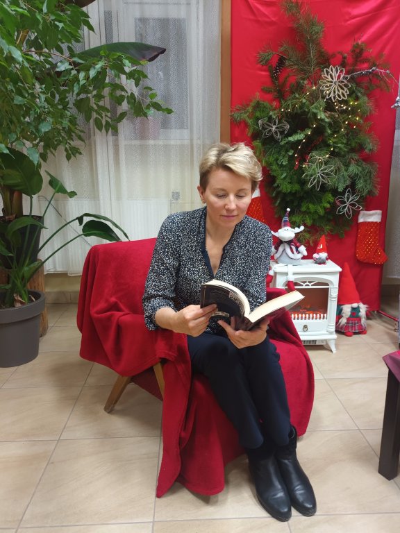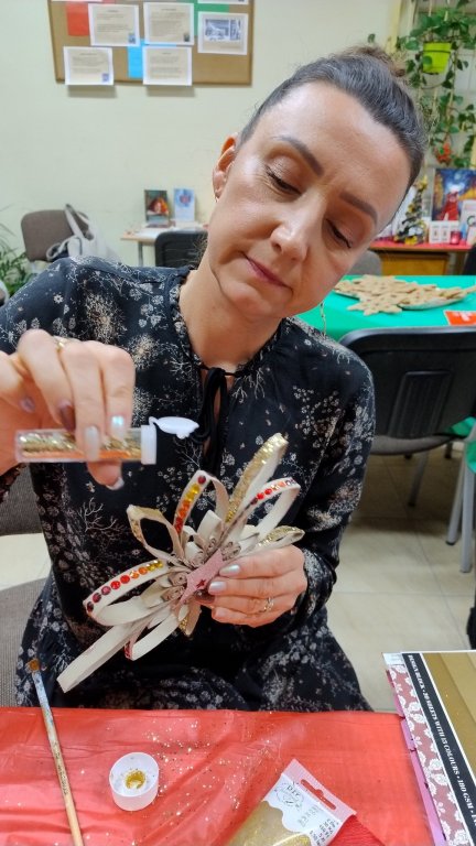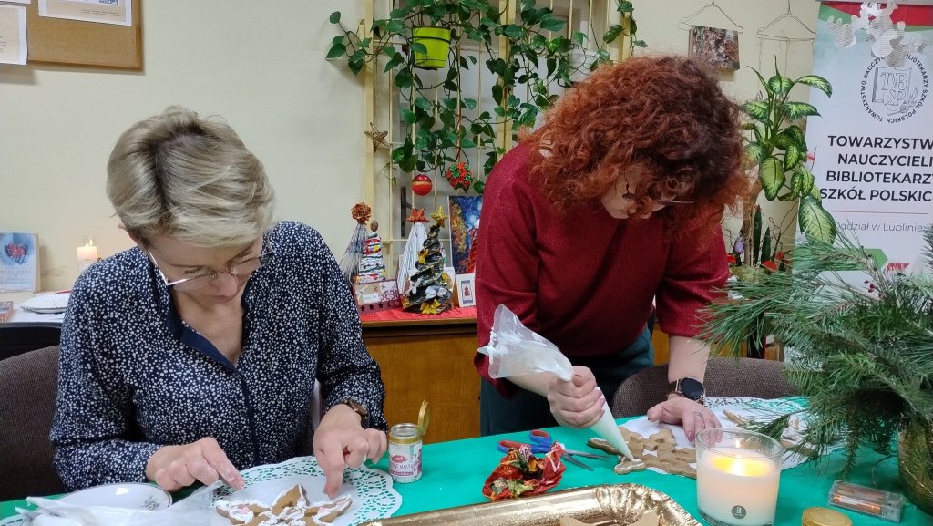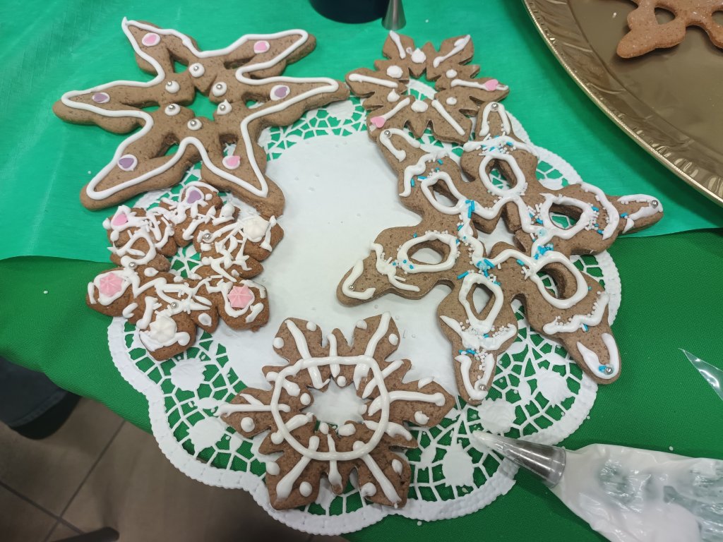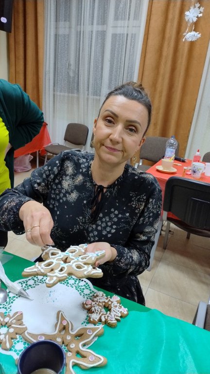 Nie ma chyba takiej drugiej biblioteki, w której można zasiąść przy kominku. Jego światło ogrzewa serce i sprawia, że całe nagromadzone w ciele napięcie odchodzi w niepamięć. Ciekawie zaaranżowane przestrzenie, udekorowane przez nauczycielki bibliotekarki panie Edytę Sosnówkę i Annę Serewę oraz grupę uczniów, wprost zapraszały, żeby oddać się twórczym działaniom. Stworzyliśmy przepiękne i mocno obsypane brokatem gwiazdki. A potem - z wielkim zapałem i kreatywnością - ozdabialiśmy śnieżnobiałym lukrem piernikowe śnieżynki. Były to prace uczennic z klasy pierwszej szkoły branżowej o kierunku cukiernik, wykonane pod czujnym okiem p. Magdaleny Adach - nauczycielki przedmiotów zawodowych i zajęć praktycznych. Poznaliśmy tajemnicę udanego lukru, lecz jej nie zdradzimy, bo muszą być jakieś bonusy dla obecnych na spotkaniu. Niektórzy specjalnie popsuli dekorację, żeby mieć pretekst do spałaszowania pierniczka. Ci wytrwali mogli zabrać swoje dzieła, przepięknie zapakowane przez panią Annę.
