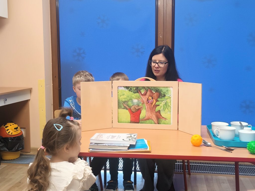 Następnie moderatorka DKK dla dzieci Julia Sośnicka za pomocą kart narracyjnych teatrzyku kamishibai zaprezentowała bajkę Słodkie kłopoty łakomej wiewiórki, która uświadomiła nam wszystkim, że nadmiar słodyczy i brak ruchu prowadzą do złego samopoczucia, a kluczem do zdrowia jest zbilansowana dieta oraz aktywność fizyczna. Lektura stała się inspiracją do rozmowy, że nawet w czasie karnawału należy zachować zdrowy rozsądek przy jedzeniu słodkości np. w tłusty czwartek. I właśnie szczególne miejsce w naszej rozmowie zajął tłusty czwartek. Uczestnicy z entuzjazmem wymieniali swoje ulubione pączki - z różą, z czekoladą, z budyniem, a także chrupiące faworki (zwane też chrustem). Poznaliśmy ciekawostki związane z tym dniem, m.in. dawny przesąd mówiący, że kto w tłusty czwartek nie zje ani jednego pączka, temu nie będzie się wiodło w nadchodzącym roku. Ta informacja wywołała wiele uśmiechów i żywą dyskusję.