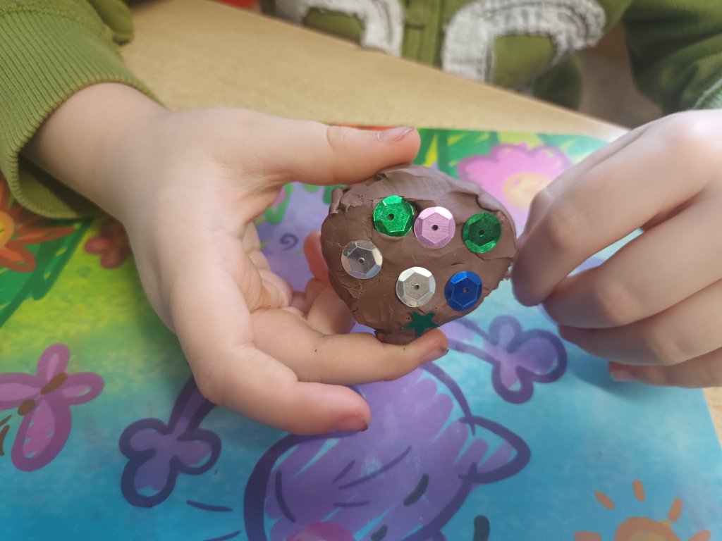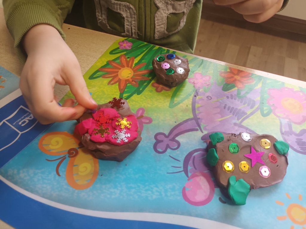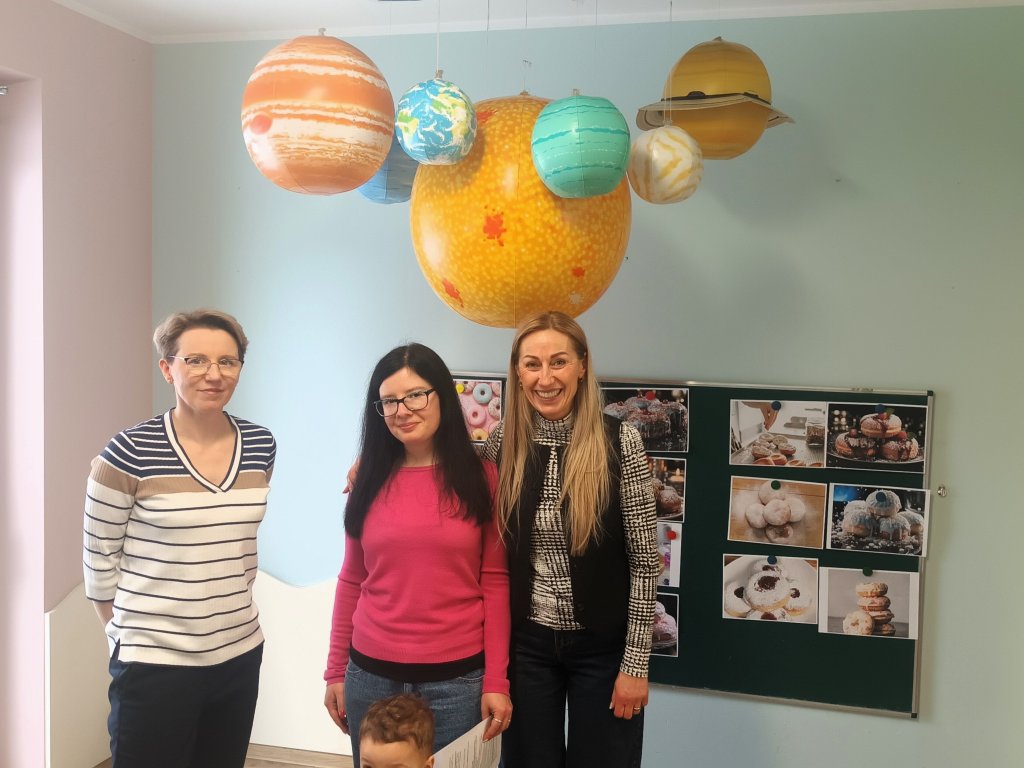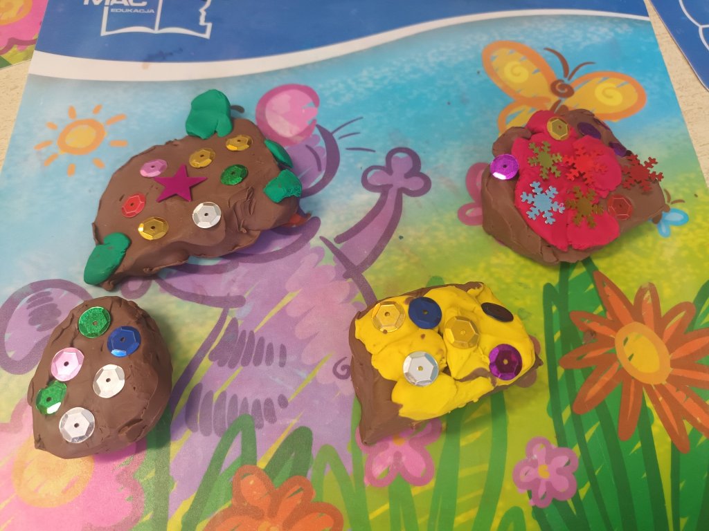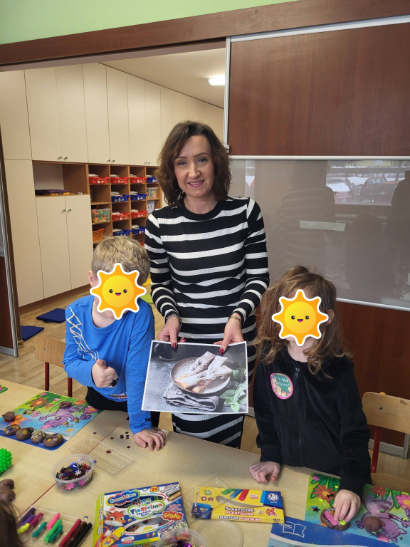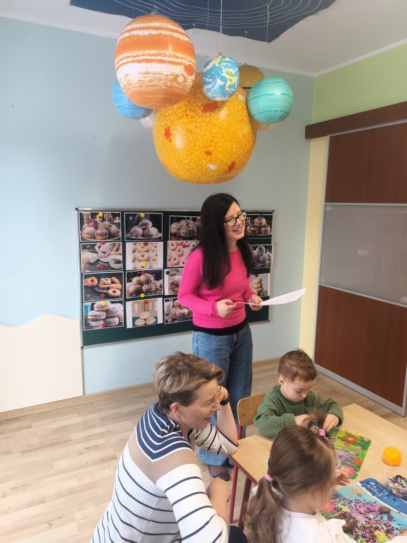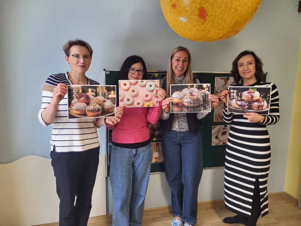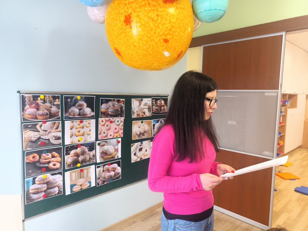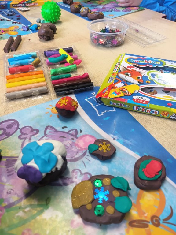 W części warsztatowej dzieci wykonały swoje wymarzone pączki. Do dyspozycji miały kolorową plastelinę, brokat, cekiny i inne ozdoby. Powstały „pyszne” pączki w najróżniejszych wariantach artystycznych. Każde dziecko mogło zaprezentować swoje wyroby i zapozować do zdjęcia.