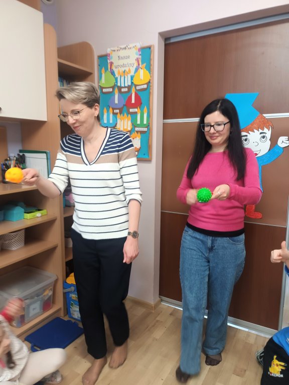 Spotkania DKK dla dzieci to również elementy zabawy ruchowej. Przy wesołej muzyce zorganizowaliśmy grę w „rosnące pączki”, „gorącego pączka” oraz „chód z pączkiem-piłeczką sensoryczną na łyżce”. Śmiechu było co niemiara, a energia i chęć uczestników do zabawy zdawała się nie mieć końca.