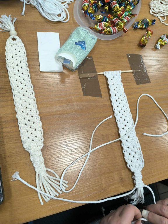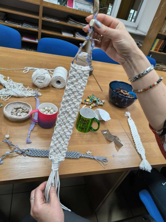 Podczas warsztatów uczestnicy poznali podstawowe sploty makramowe oraz zasady pracy ze sznurkiem. Krok po kroku wykonywali własne zakładki, mając możliwość wyboru rodzaju sznurków i detali dekoracyjnych, co pozwoliło na stworzenie niepowtarzalnych, autorskich prac.